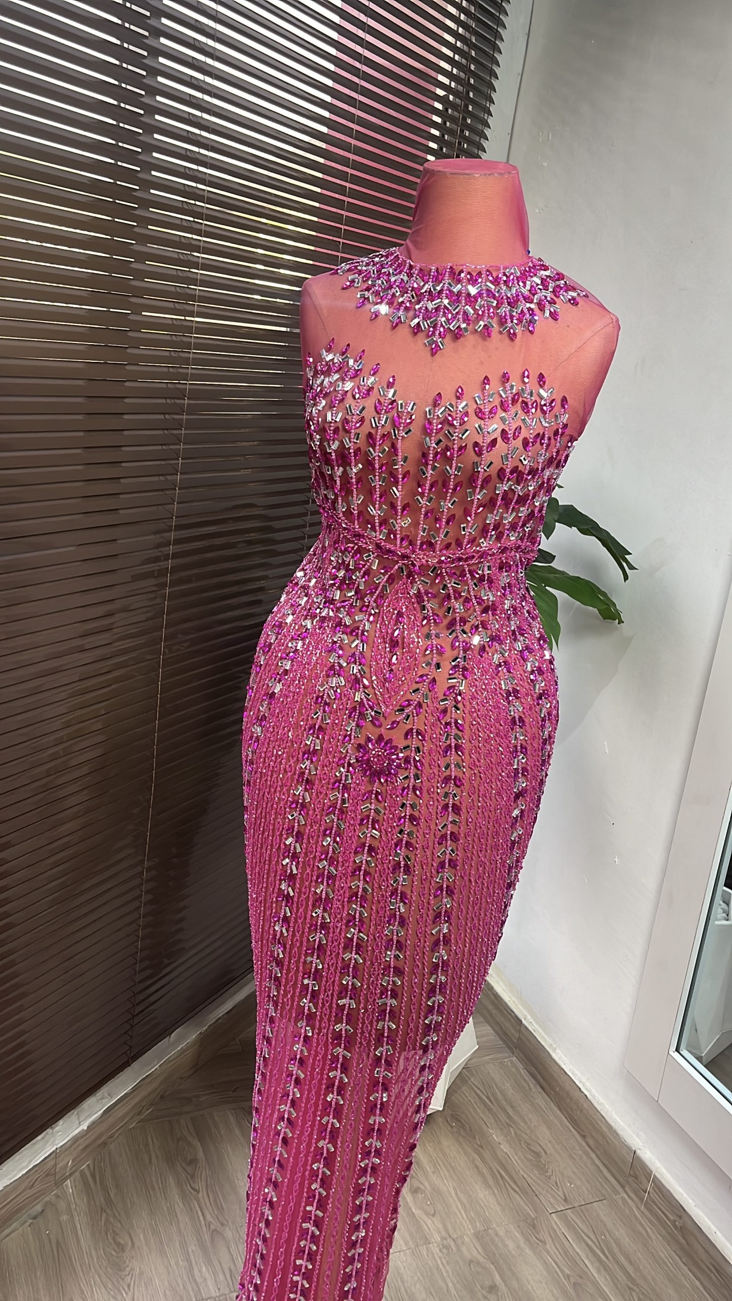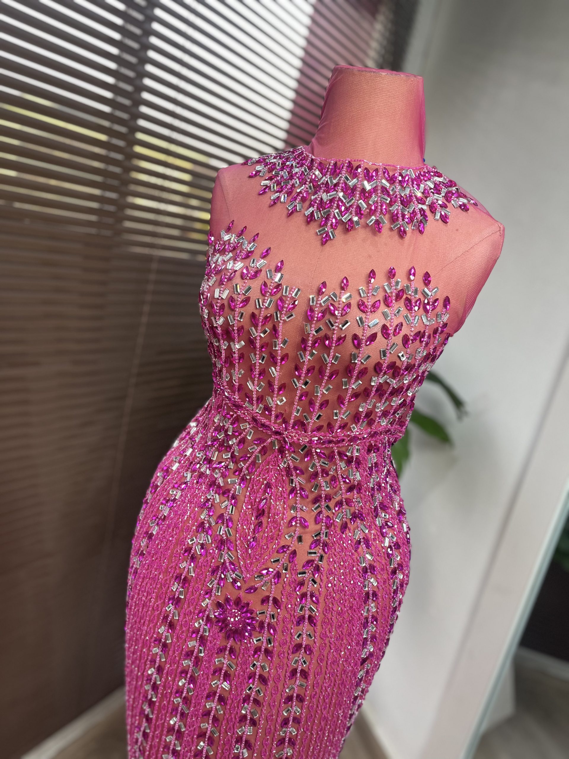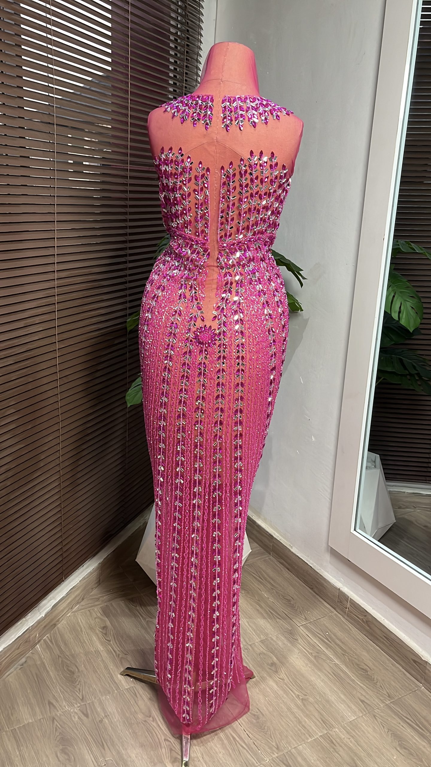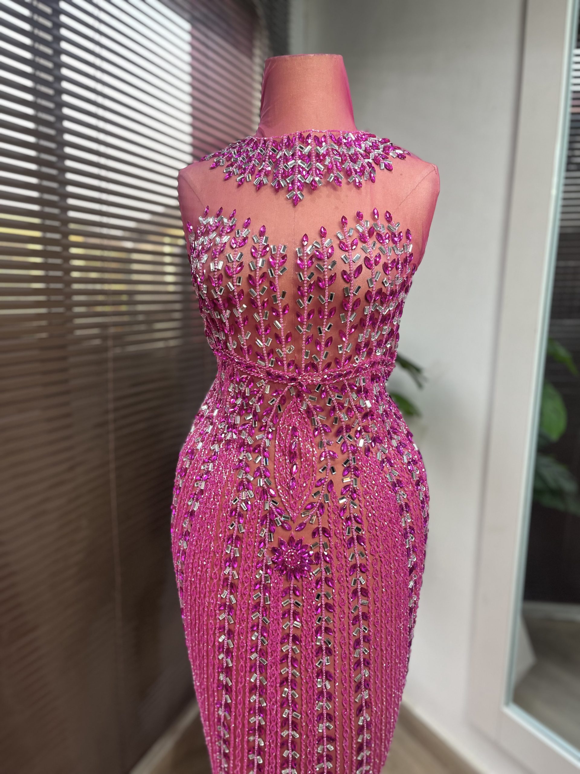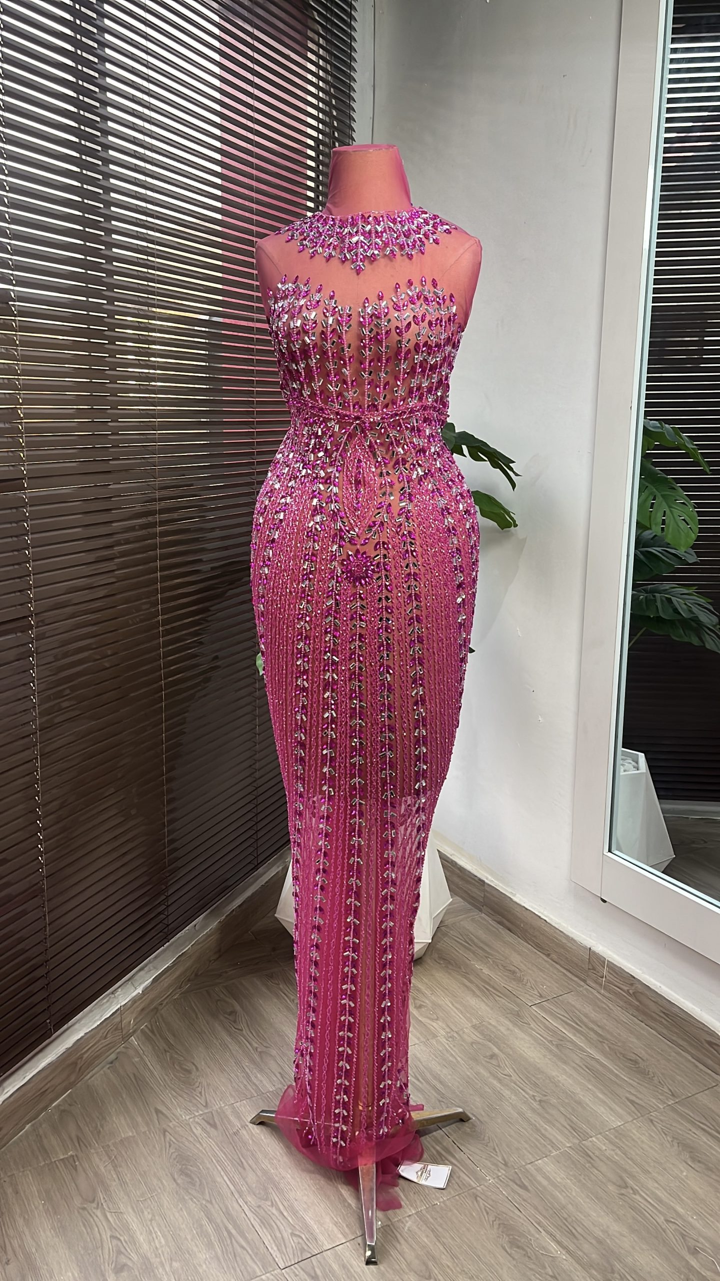 This enchanting panel dress design is embellished with crystal stones, highlighting intricate detailing on both the front and back. Crafted with meticulous care to seamlessly complement your curves, it ensures a perfect fit through its detailed design.
