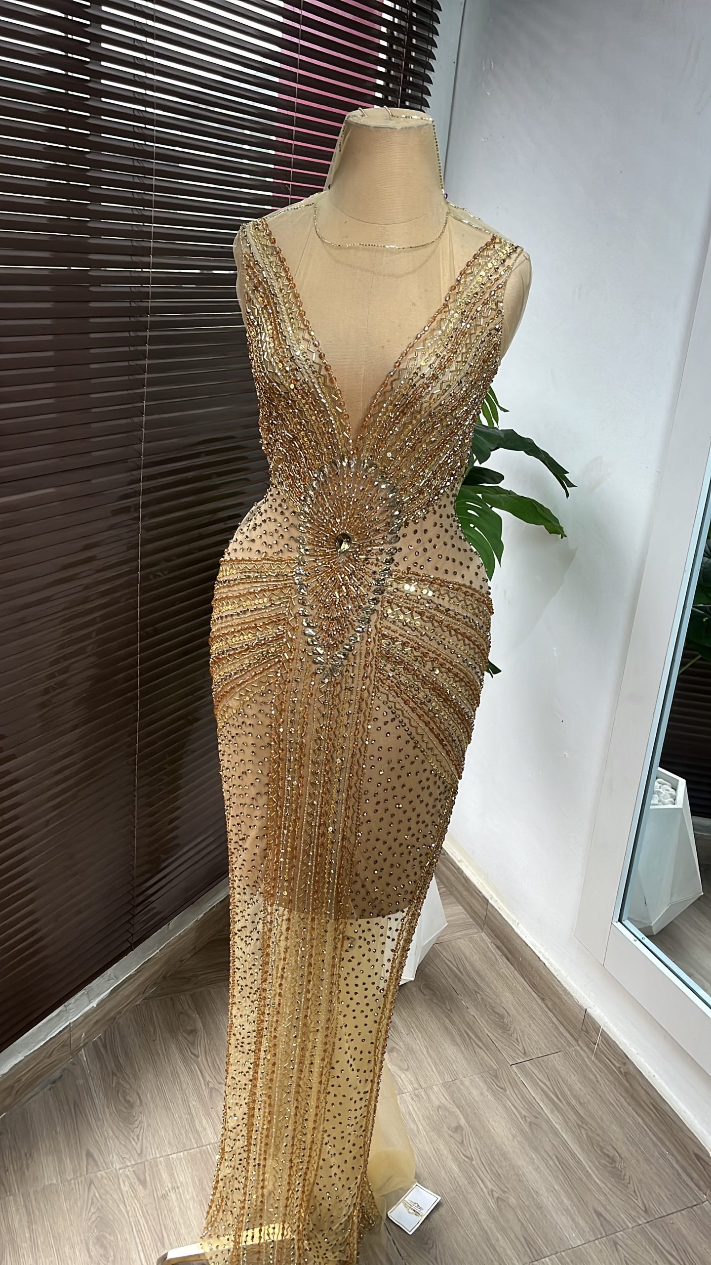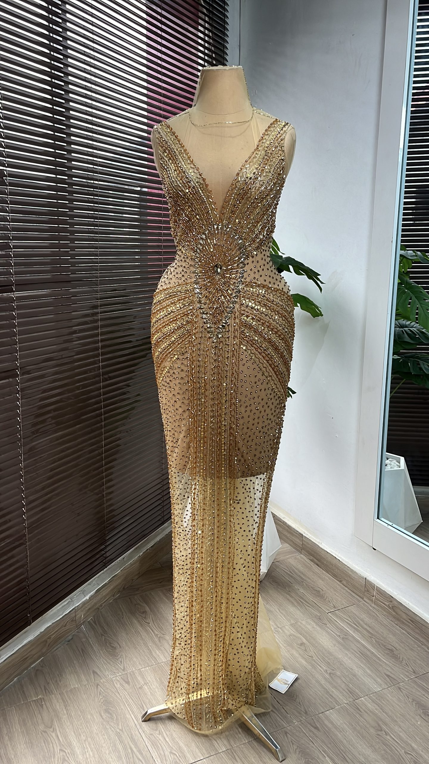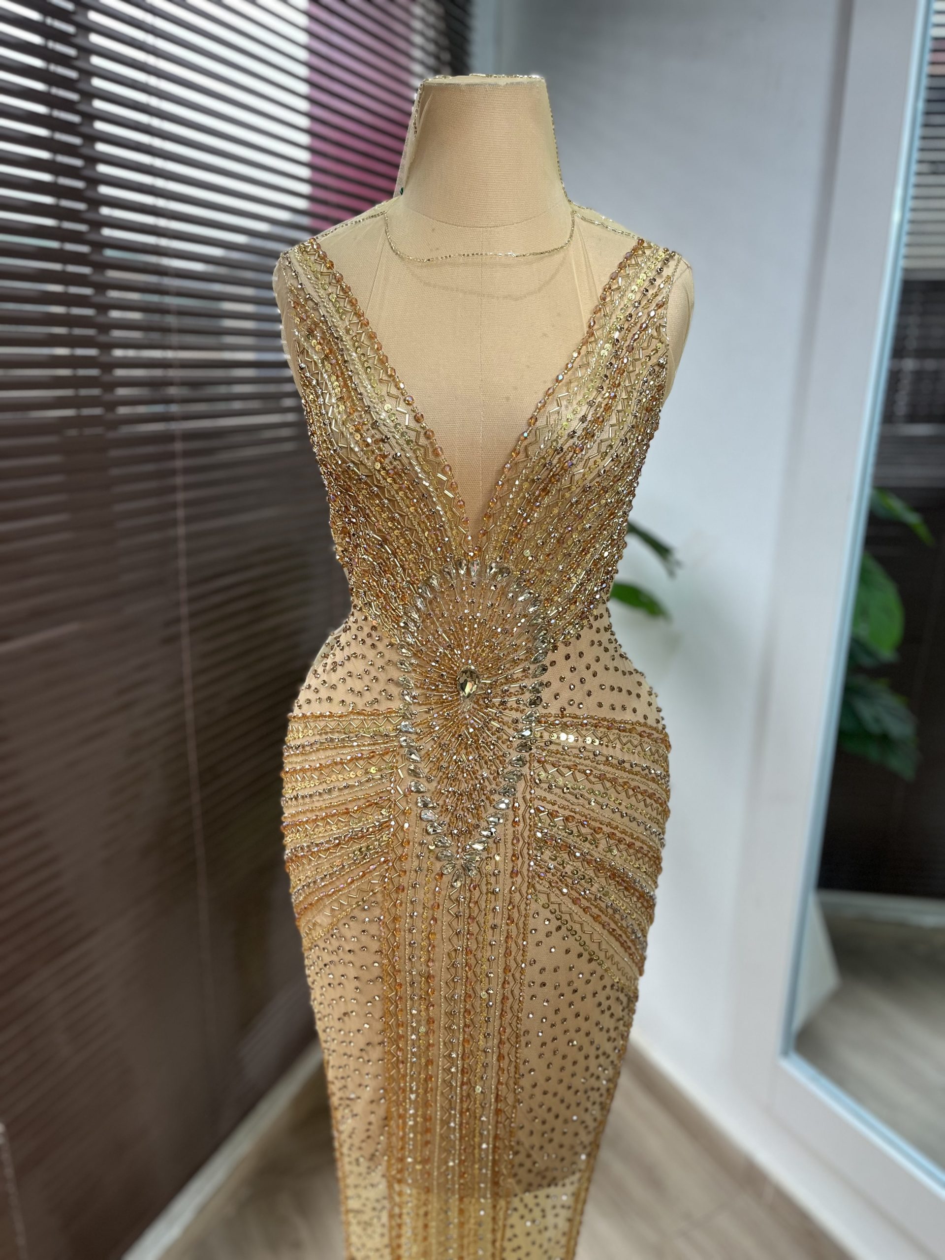 An exquisite lace panel dress in neutral shades, adorned with stones and crystal pearls, making it the ideal selection for any special occasion.