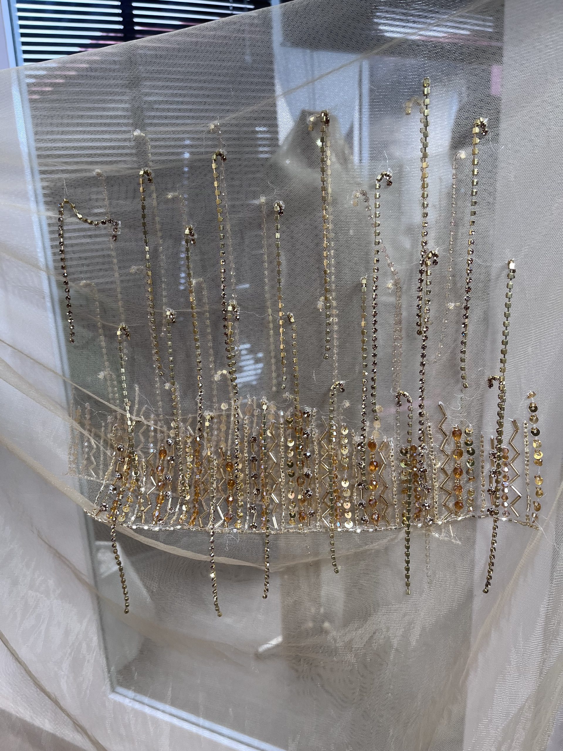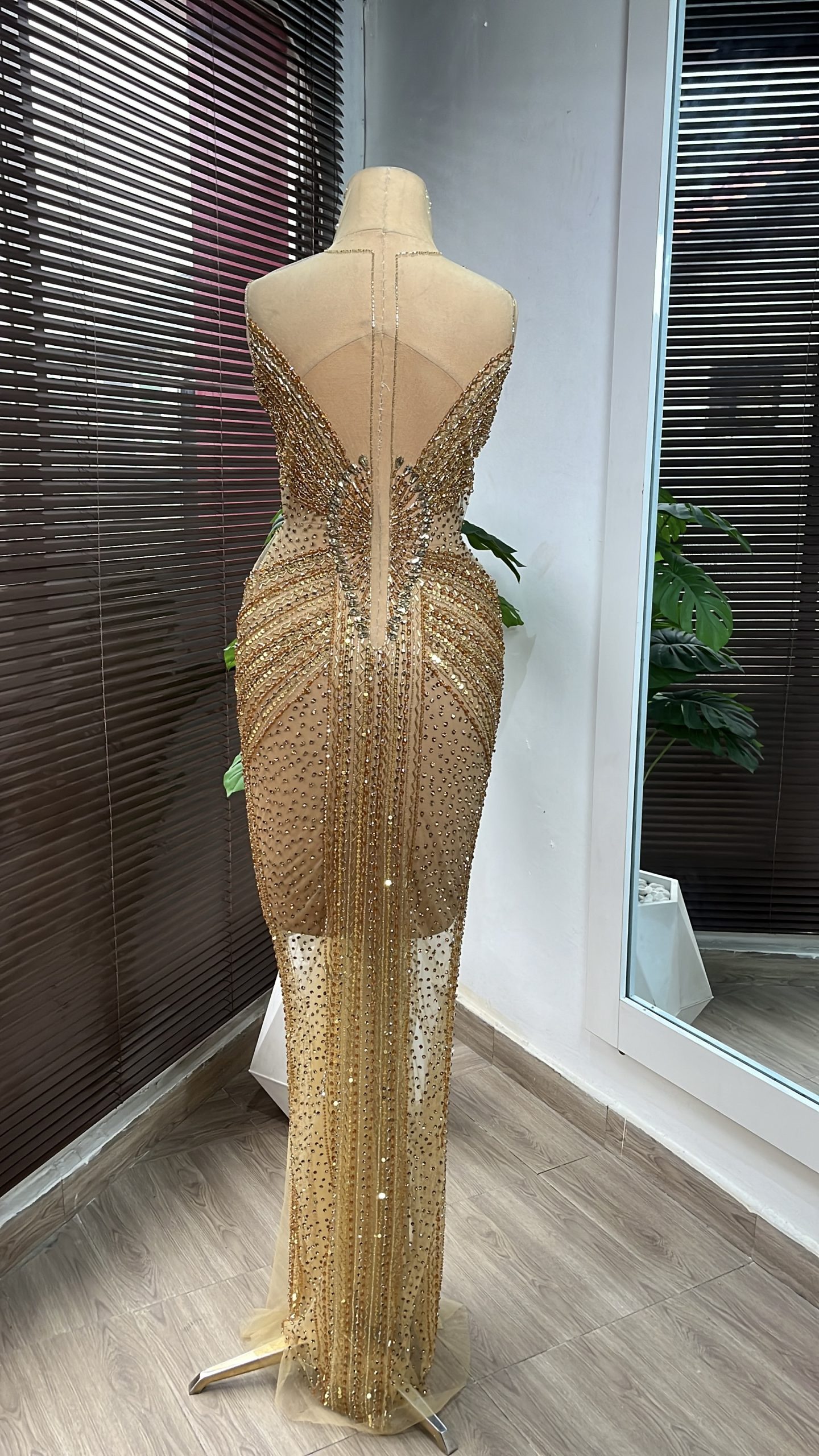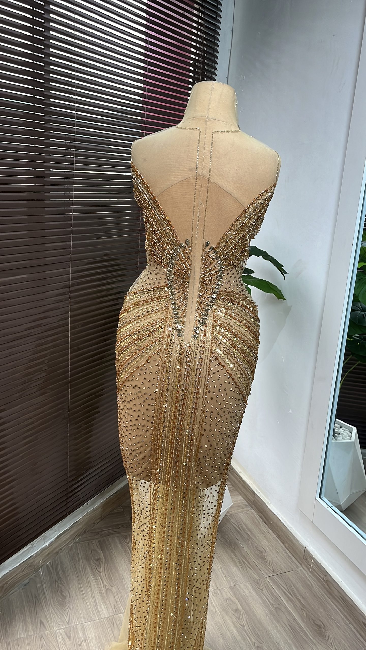 An exquisite lace panel dress in neutral shades, adorned with stones and crystal pearls, making it the ideal selection for any special occasion.
