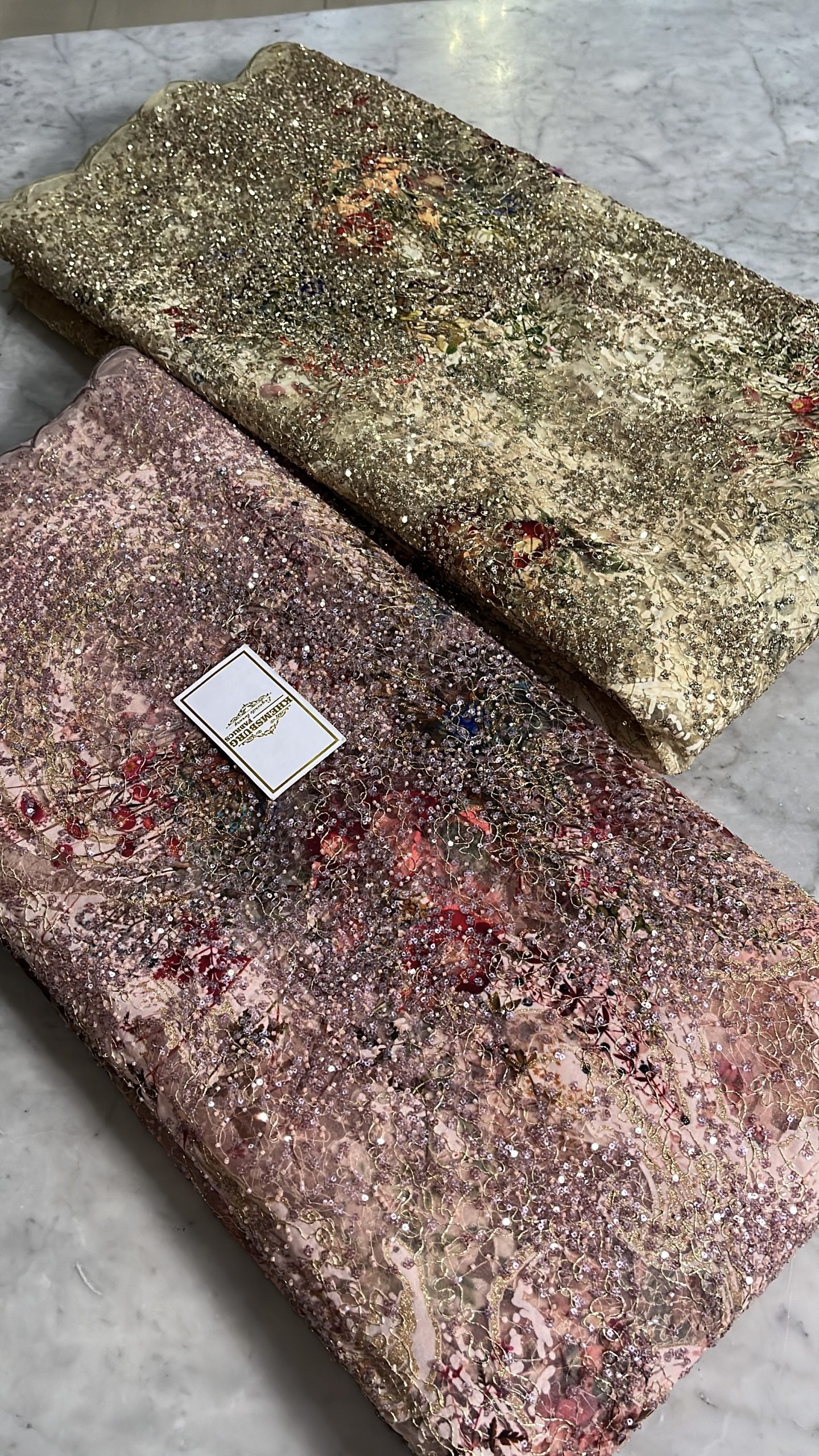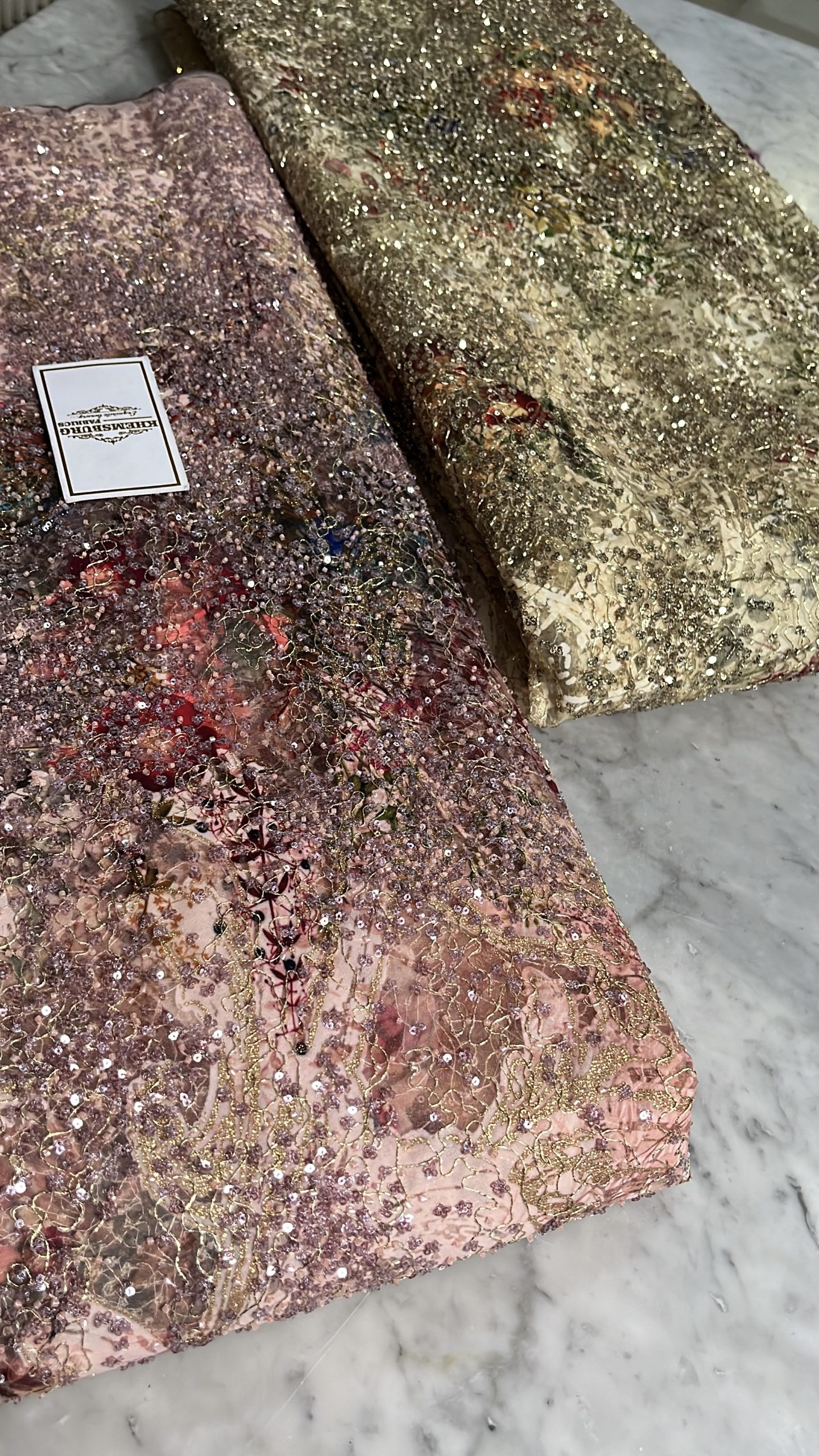 This is a perfect mix of dazzling beaded paired with a rich ombre flocking metallic design to make a statement making look.