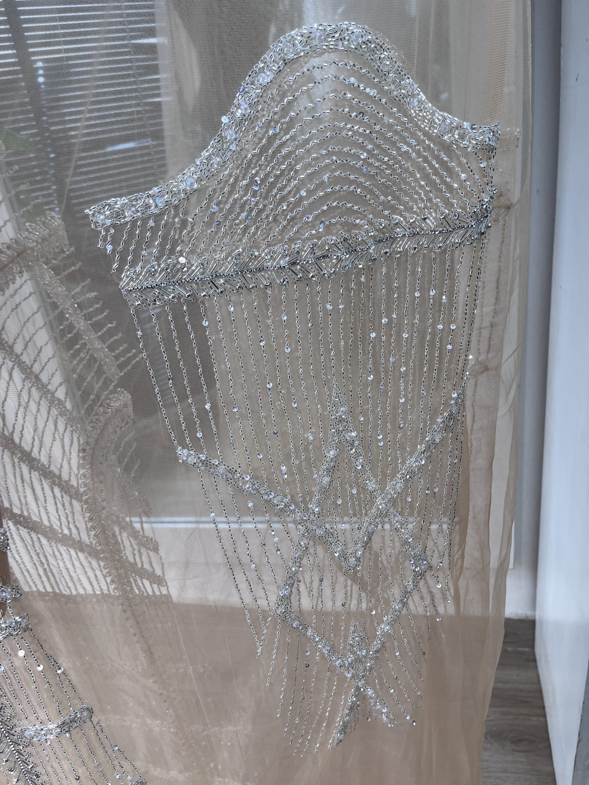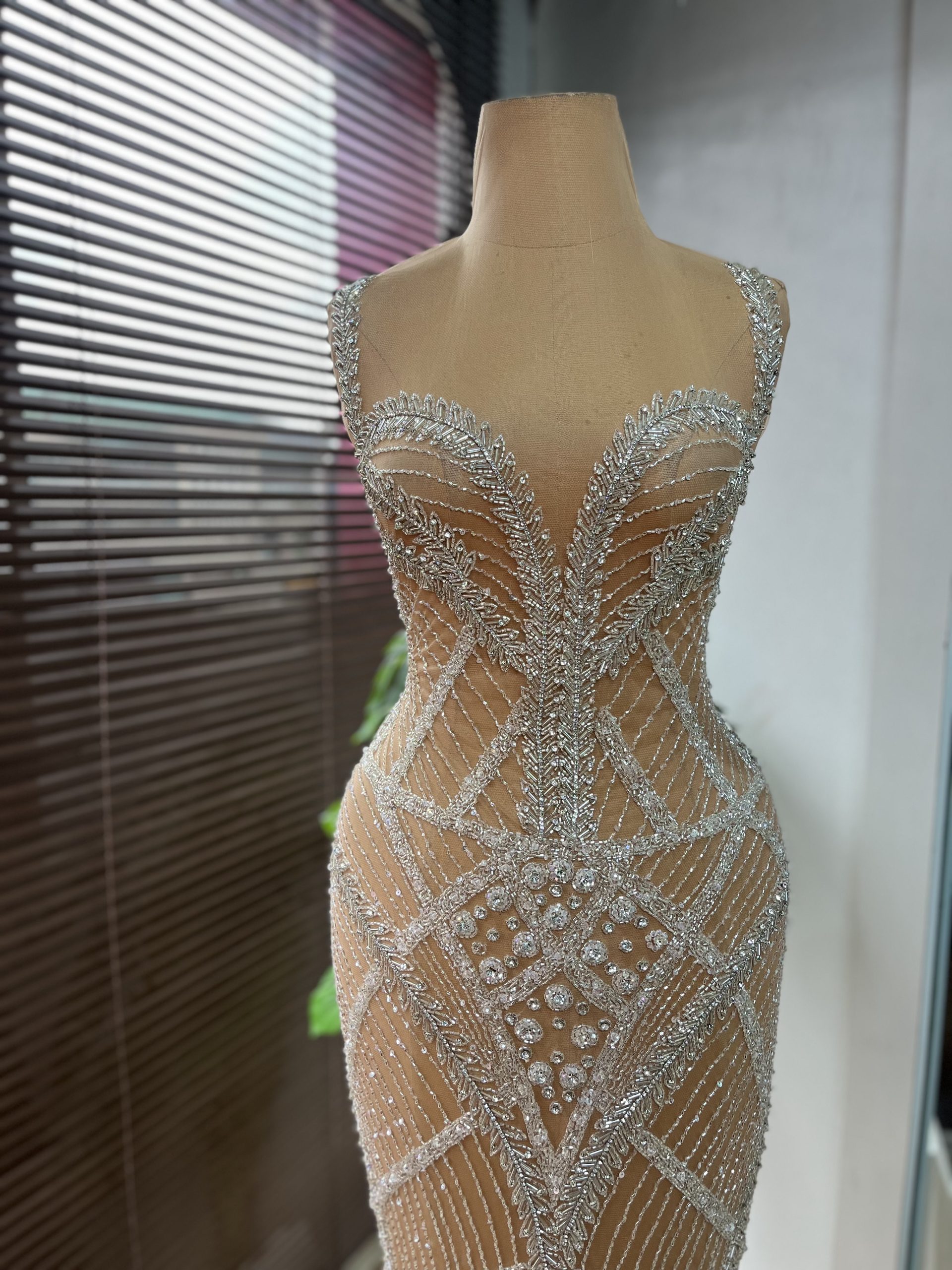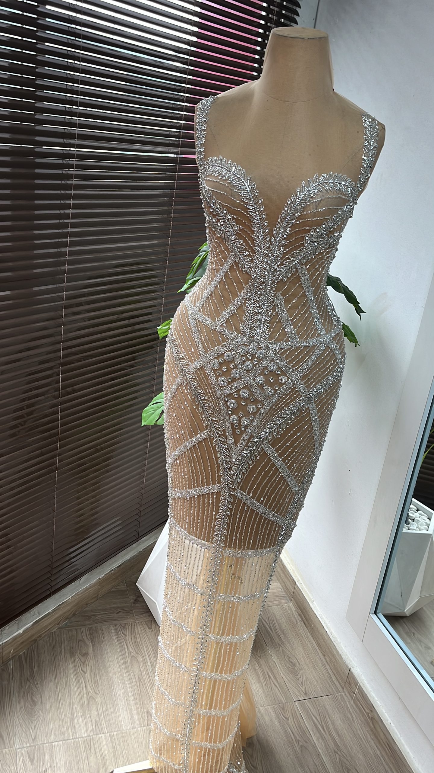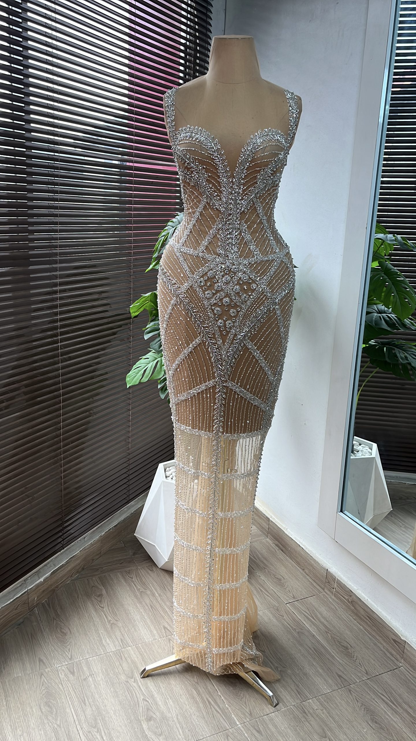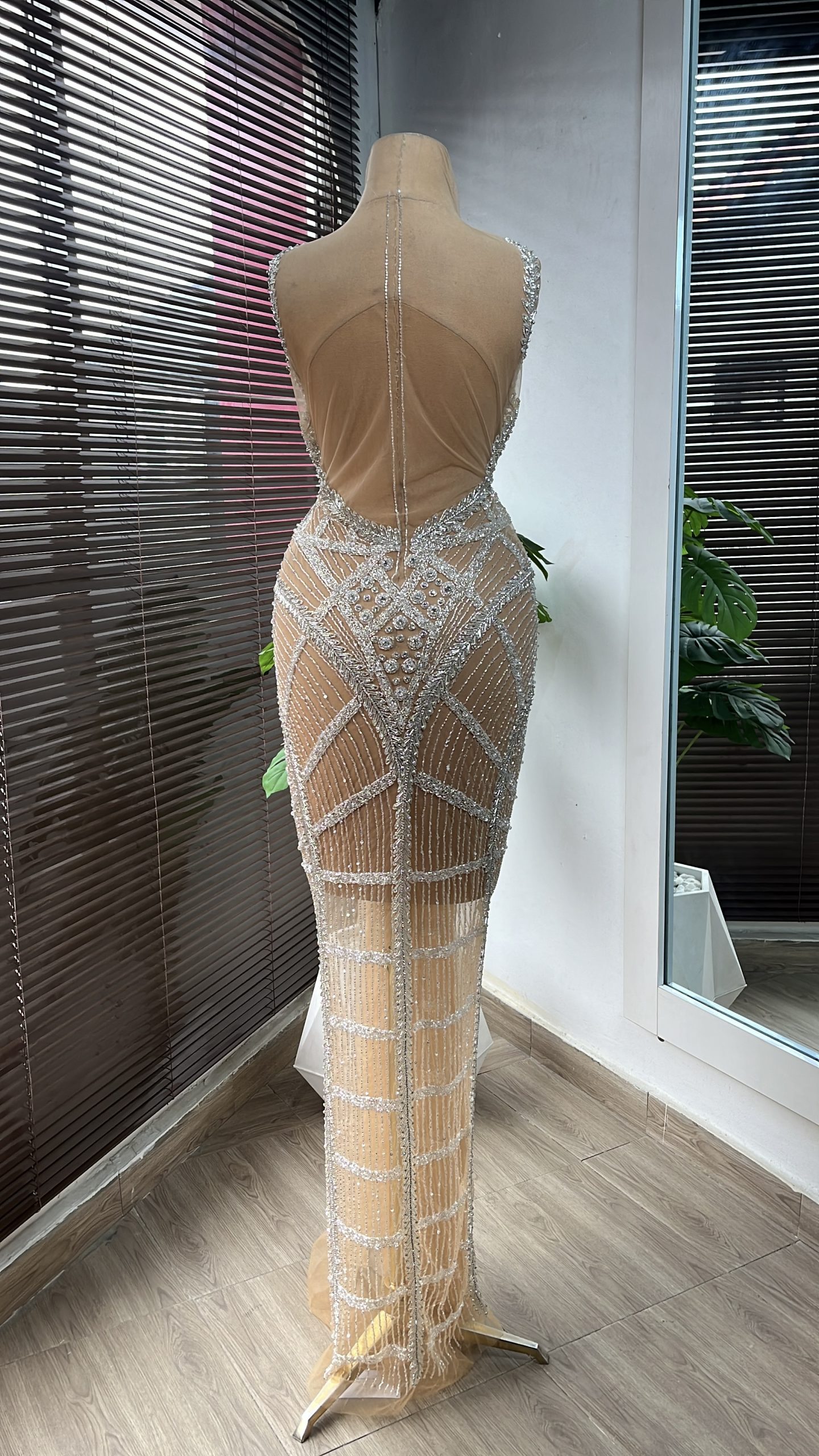 Crafted with precision, this alluring panel dress design boasts crystal stones and intricate embellishments adorning both the front and back. Meticulously fashioned to elevate your silhouette, it has been purposefully created to ensure a seamless and impeccable fit, embodying perfection in every detail.