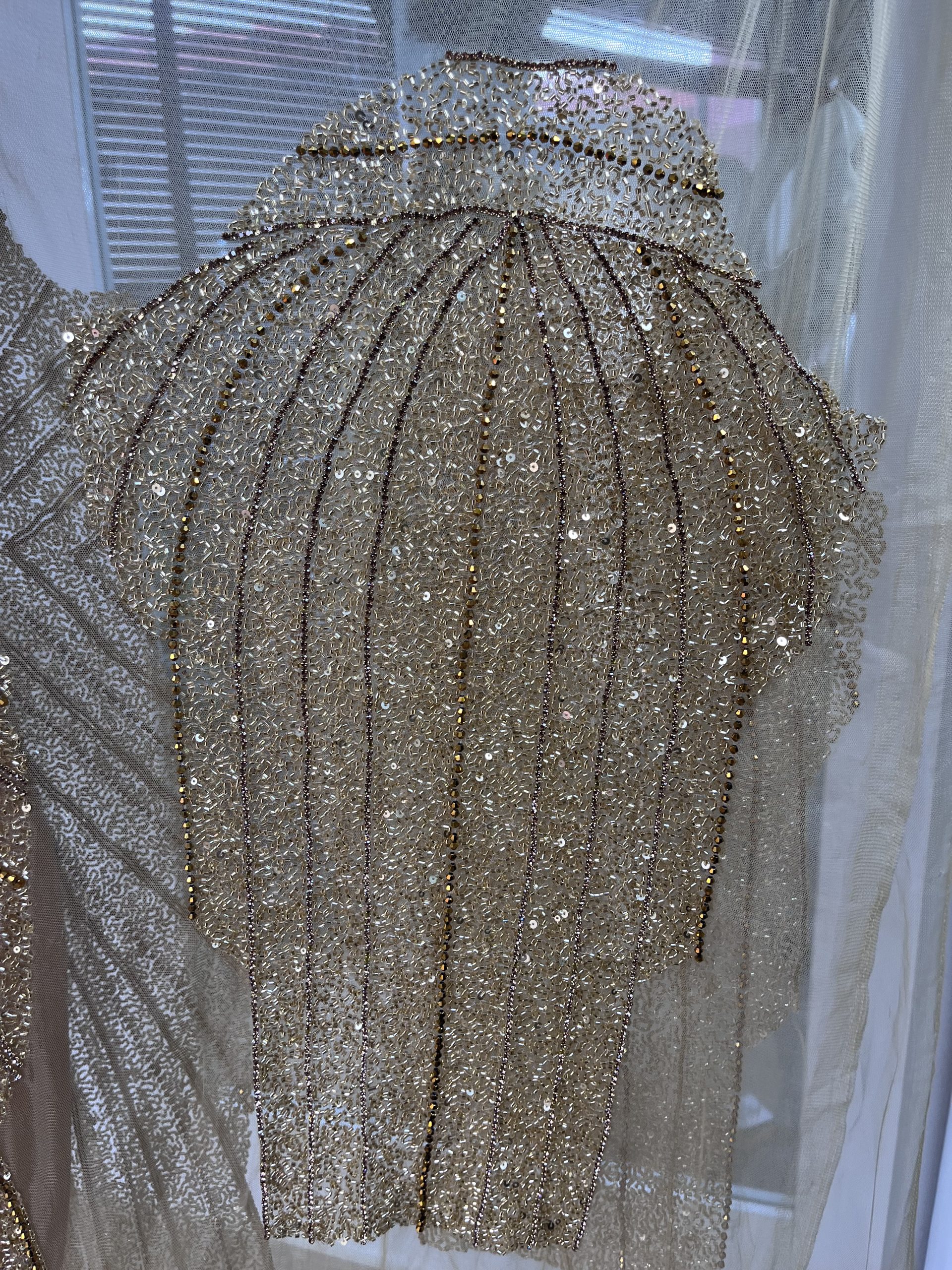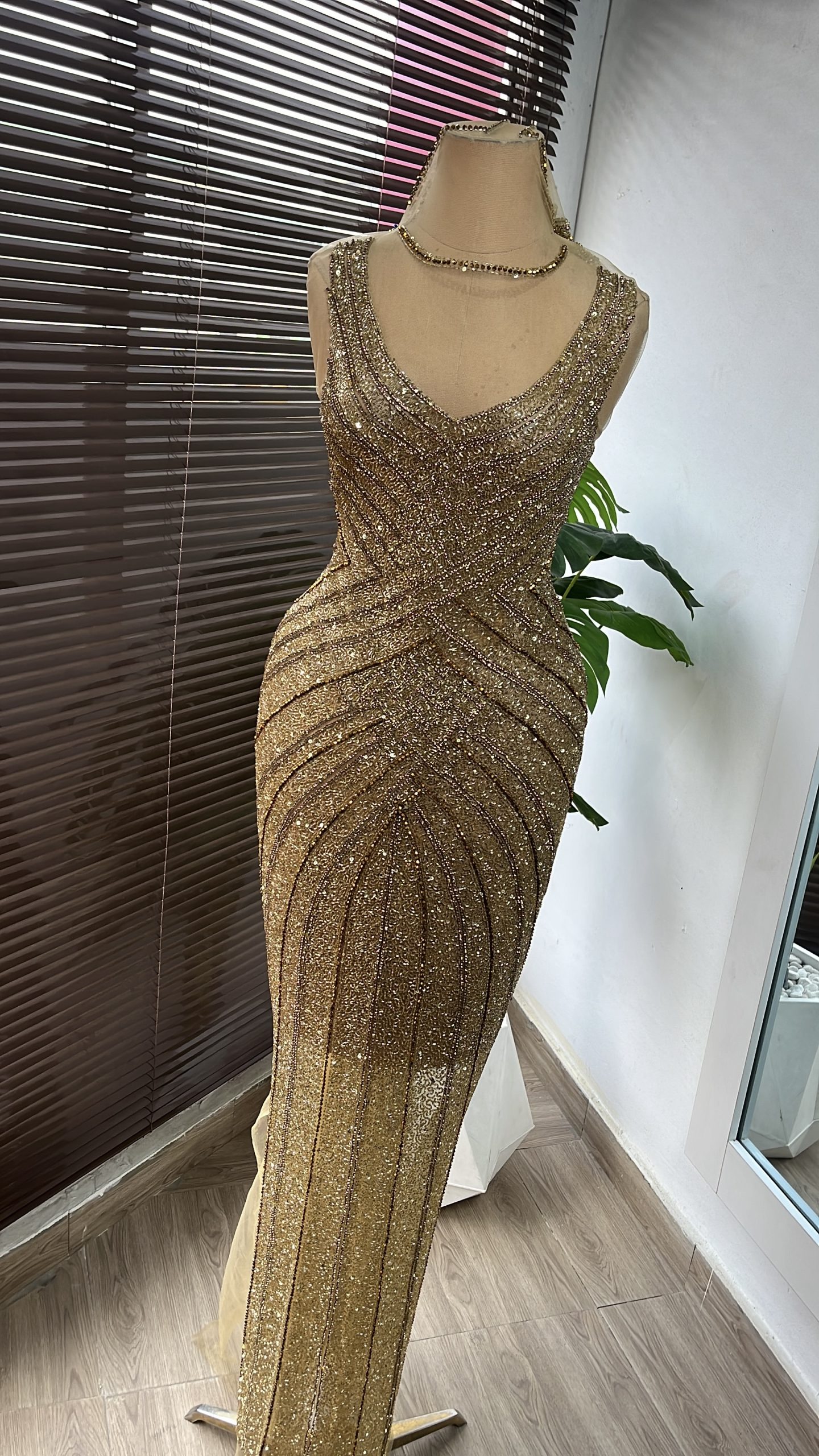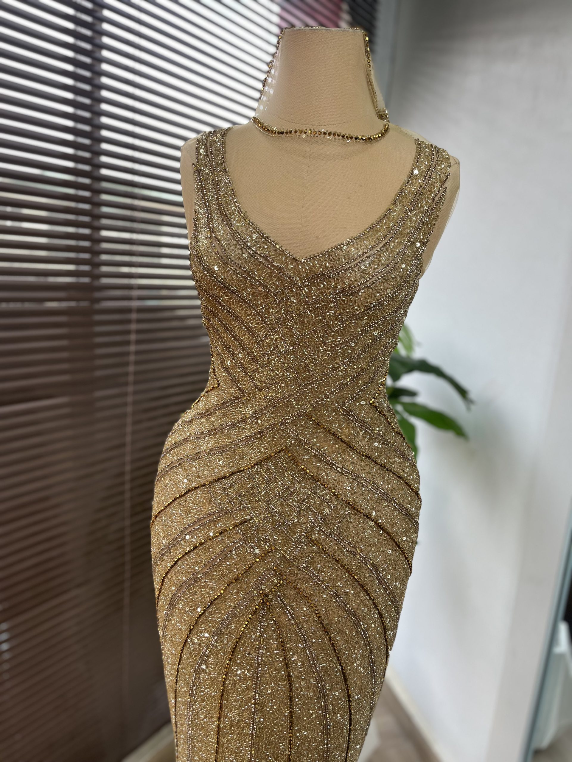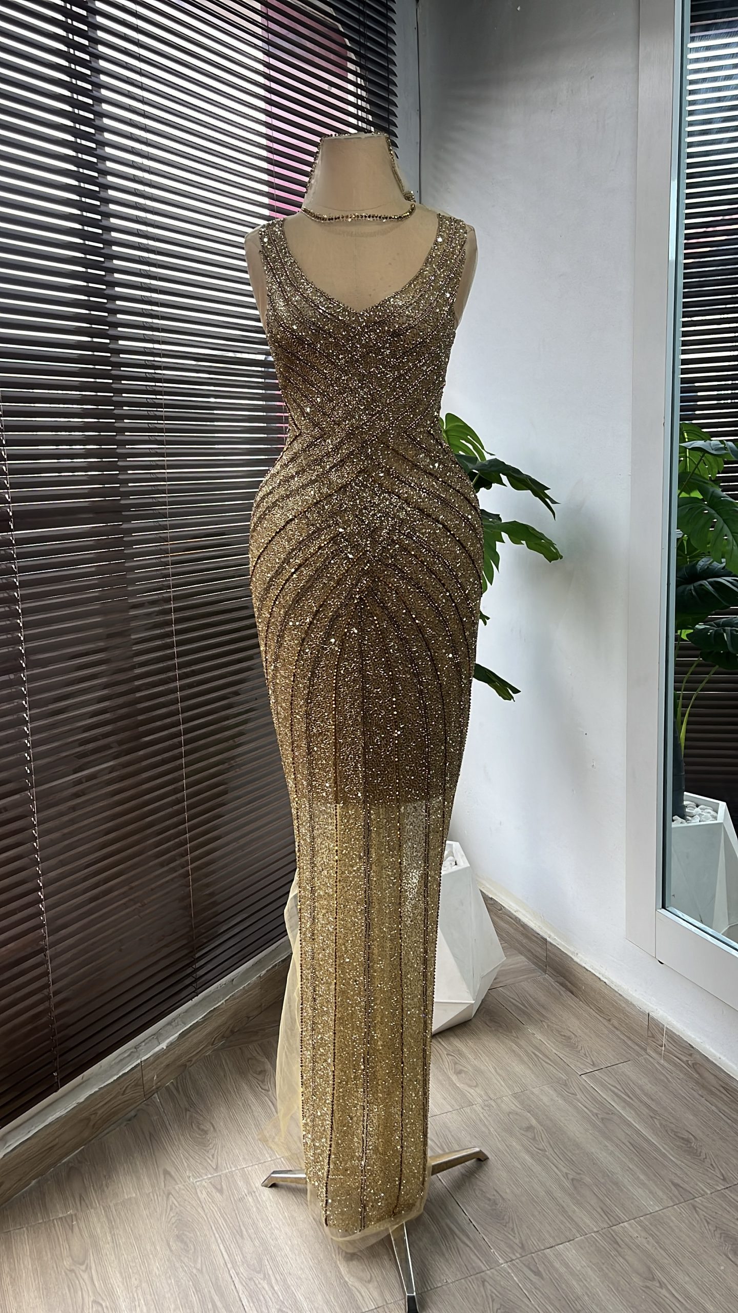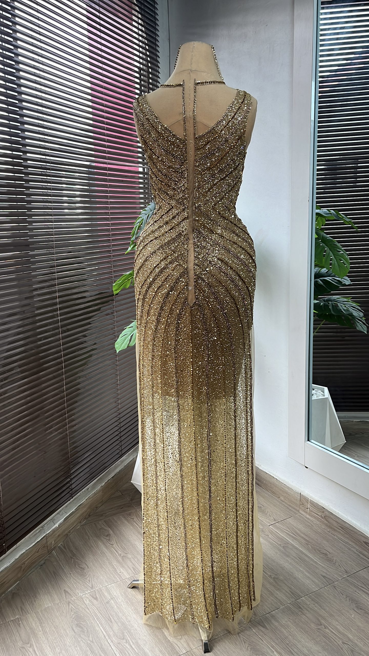 Featuring radiant crystal stones and elaborate embellishments on both the front and back, this enchanting panel dress design has been meticulously fashioned to enhance your silhouette. Purposefully created for a smooth and impeccable fit, it represents perfection in every detail.